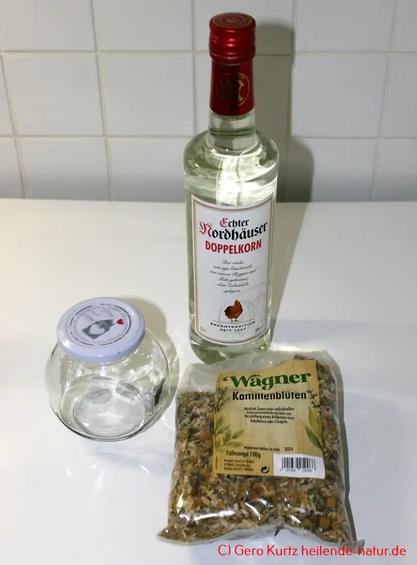 Zutaten und sinnvolle Helfer bei der Herstellung der Kamillentinktur: